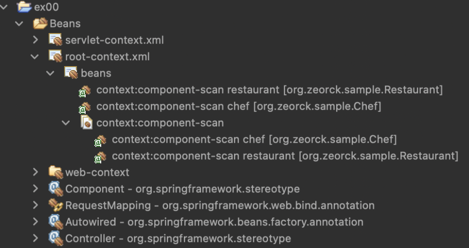 3) root-context.xml 에 설정되어 있는 <context:component-scan> 태그의 내용을 통해 지정된 'org.zerock.sample' 패키지를 스캔함.