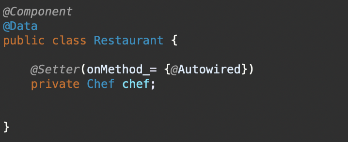 - Restaurant 의 @Data 어노테이션으로 getter, setter 가 자동으로 생성됐음. setter의 onMethod_ 속성을 이용해서 @Autowired 추가.
