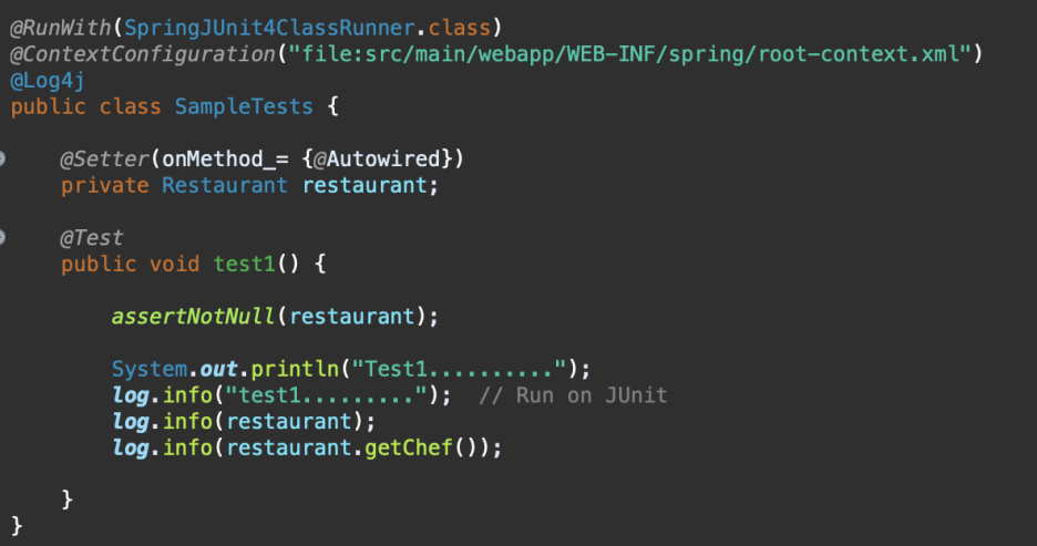 - @ContextConfiguration: 지정 클래스나 문자열을 이용해서 필요한 객체들을 스프링 내 객체로 등록하게 됨. (classpath: 나 file: 이용해서 root-context.xml 경로 지정)