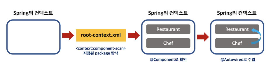 5) Restaurant 객체는 Chef 객체가 필요하다는 어노테이션 @AutoWired 설정이 있으므로 스프링은 Chef 객체의 레퍼런스를 Restaurant 객체에 주입함.