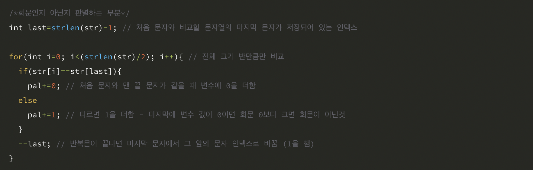 -> 문자열을 비교하기 위해 문자열의 크기/2 만큼 반복해서 첫문자와 마지막 문자, 그리고 다음 문자 두개 이런식으로 비교할 것임.