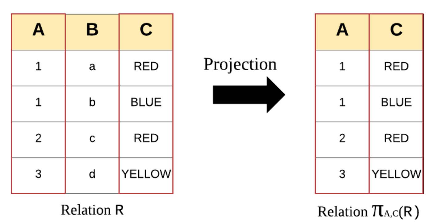 ∏(칼럼 1, 칼럼 2, ..., 칼럼 n)(릴레이션 이름:R) | 릴레이션 R에서 주어진 칼럼으로만 구성된 튜플들을 반환한다. |