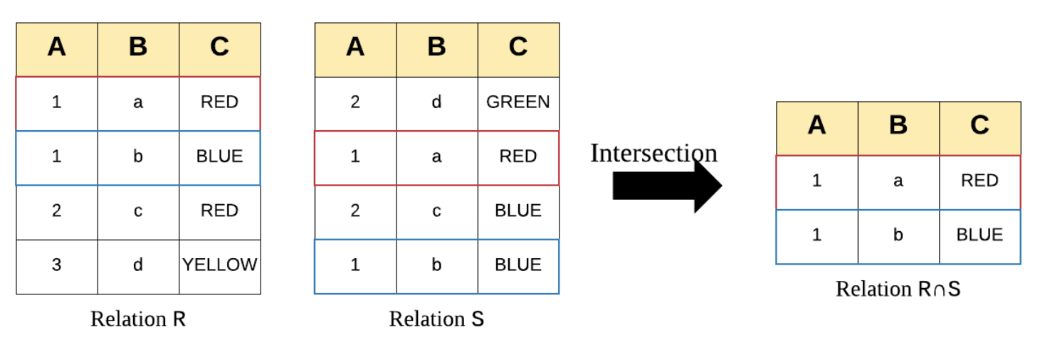 | Intersection | ∩ | R ∩ S | 릴레이션 R과 S의 교집합을 반환한다. |