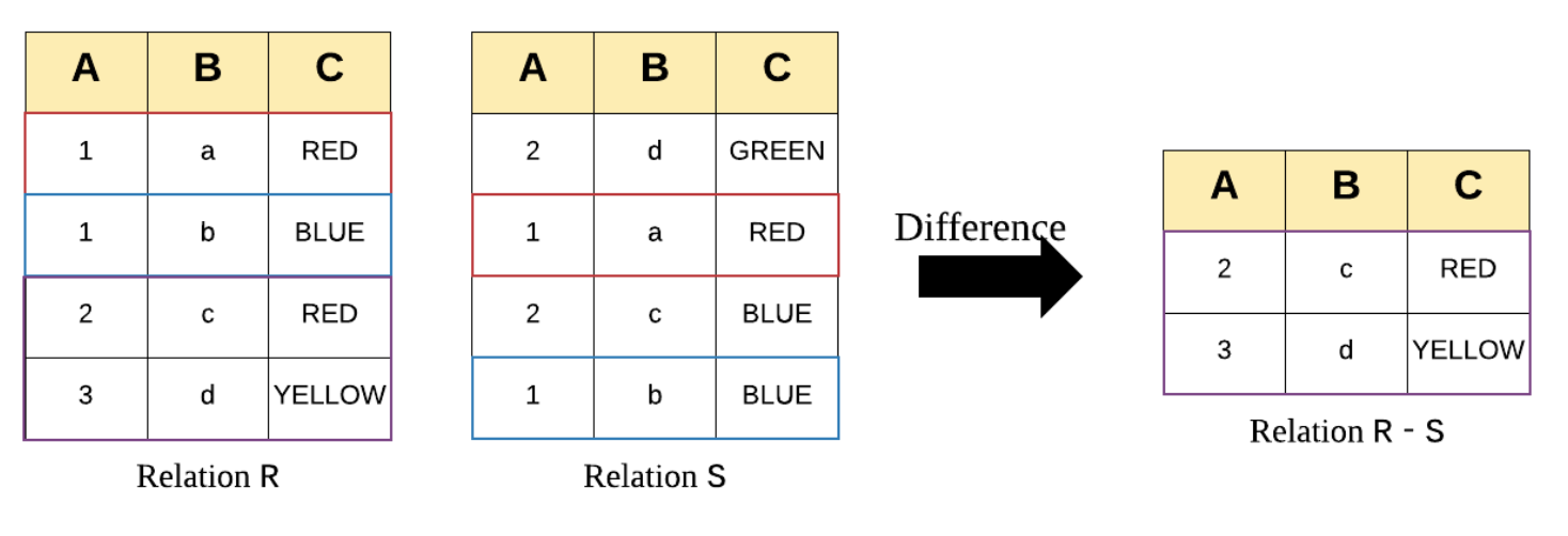 | Difference | - | R - S | 릴레이션 R과 S의 차집합을 반환한다. |