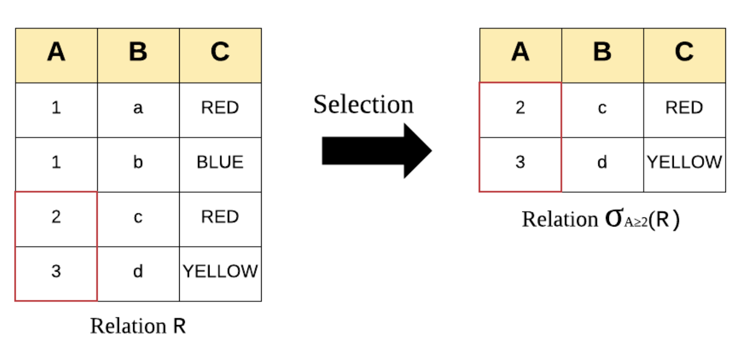 σ (조건)(릴레이션 이름:R) | 릴레이션 R에서 조건을 만족하는 튜플들을 반환한다. |