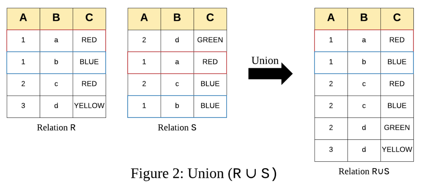 | Union | ∪ | R ∪ S | 릴레이션 R과 릴레이션 S의 합집합을 반환한다. |