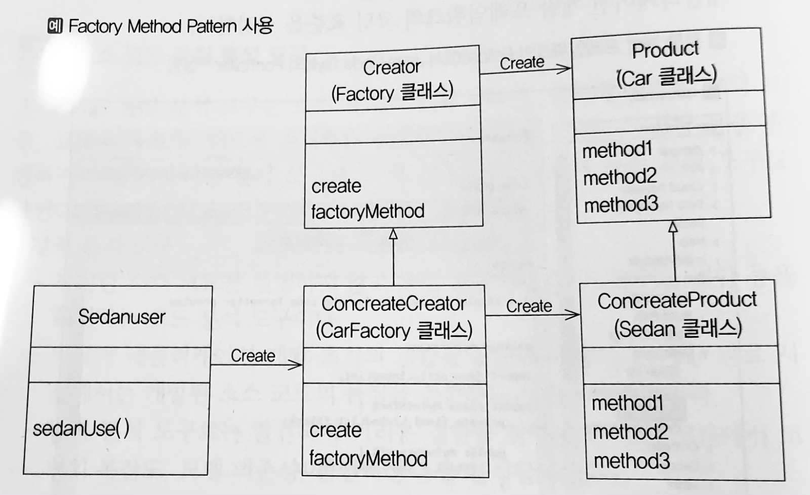 - 팩토리 메소드 패턴: 상위 클래스에서 객체를 생성하는 인터페이스를 정의하고, 이를 상속 받는 하위 클래스에서 실제 객체를 만드는 방식. 객체를 생성하는 인터페이스와 실제 객체를 생성하는 클래스를 분리할 수 있는 방식