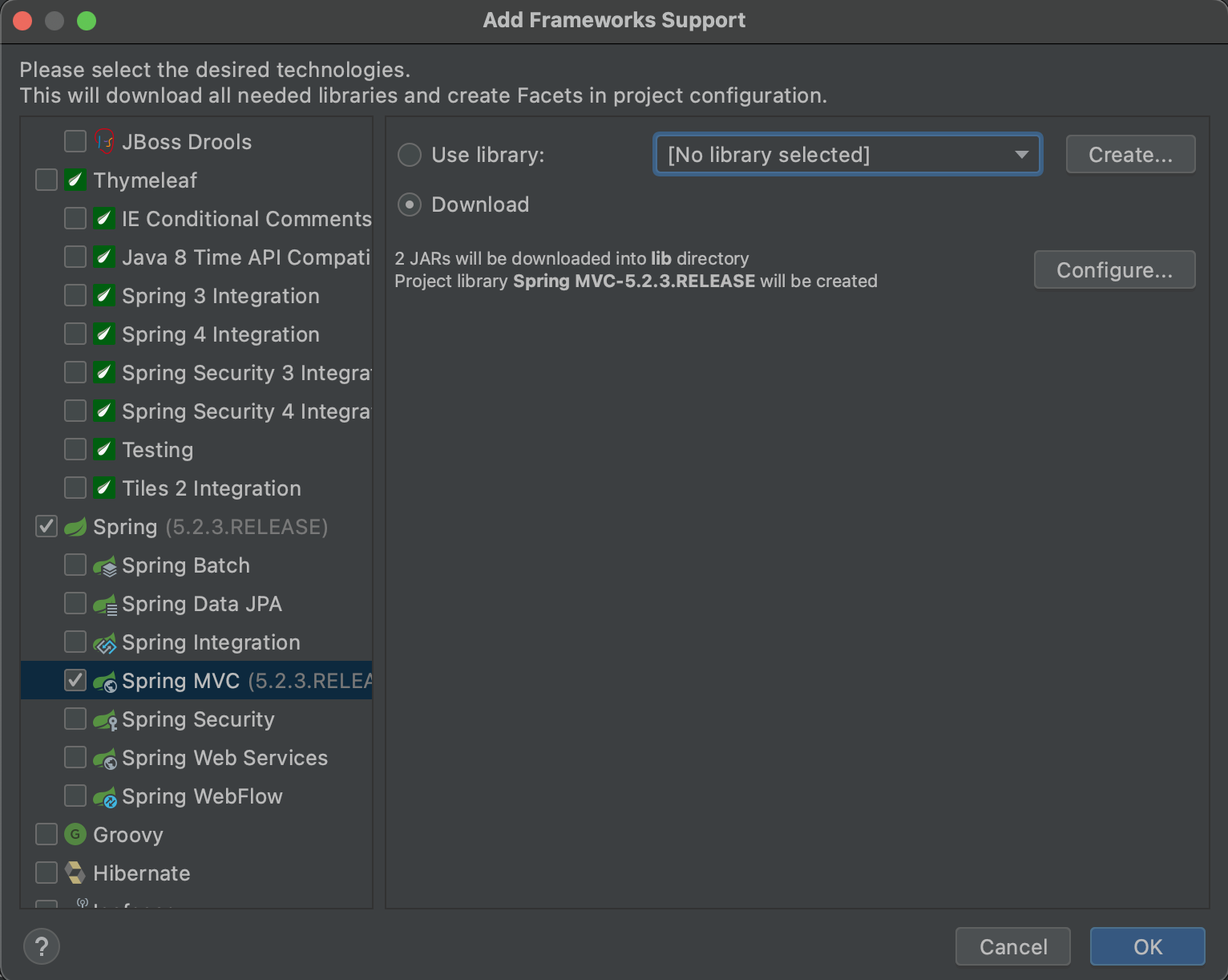 (4) 프로젝트 폴더 우클릭 > Add Framework Support > Spring MVC 선택후 추가