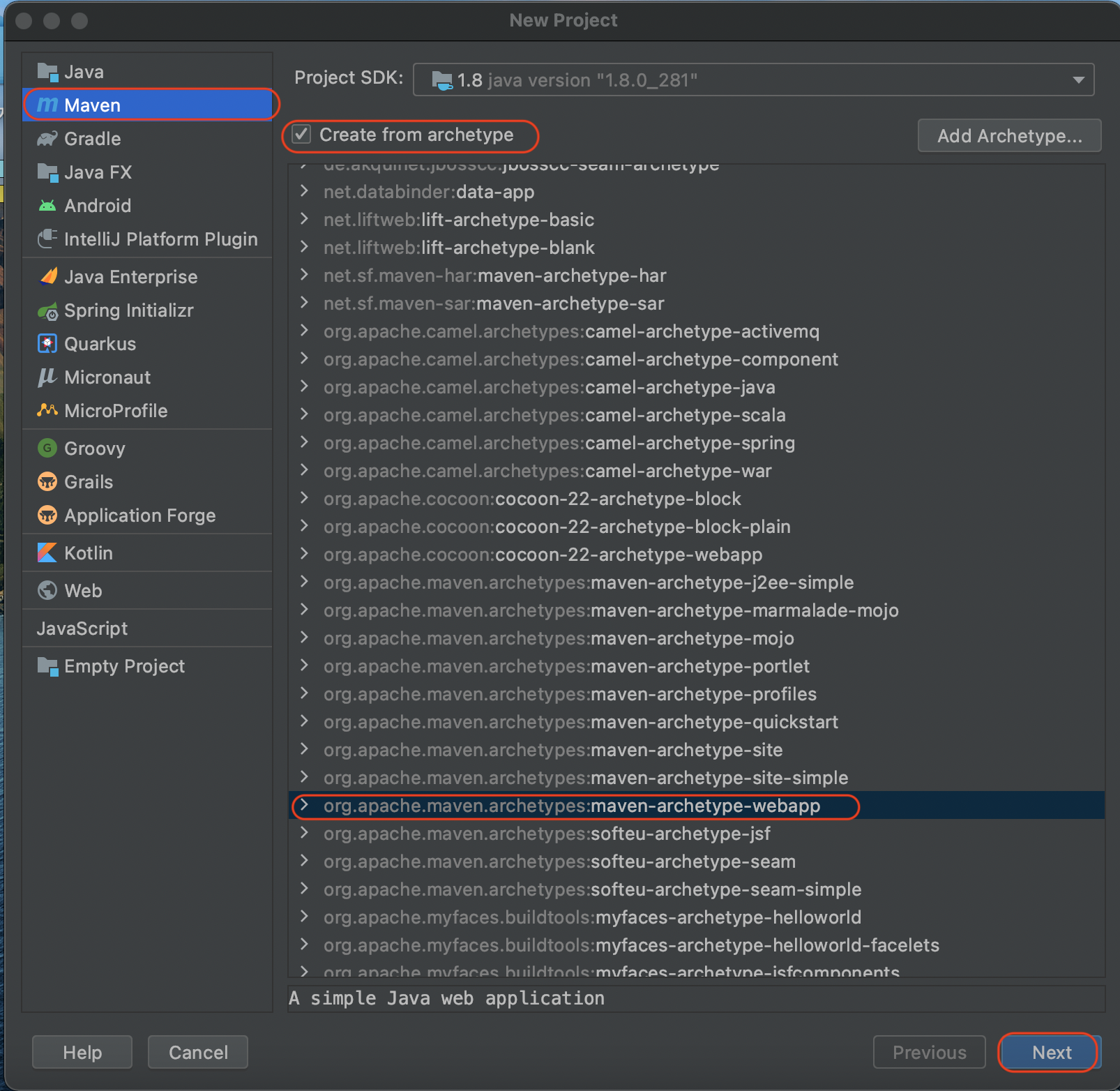(1) 'New Project' → 'Maven' 프로젝트 선택 → 'Create from archetype' 항목 체크 → 'webapp' 항목 체크 후 확인
