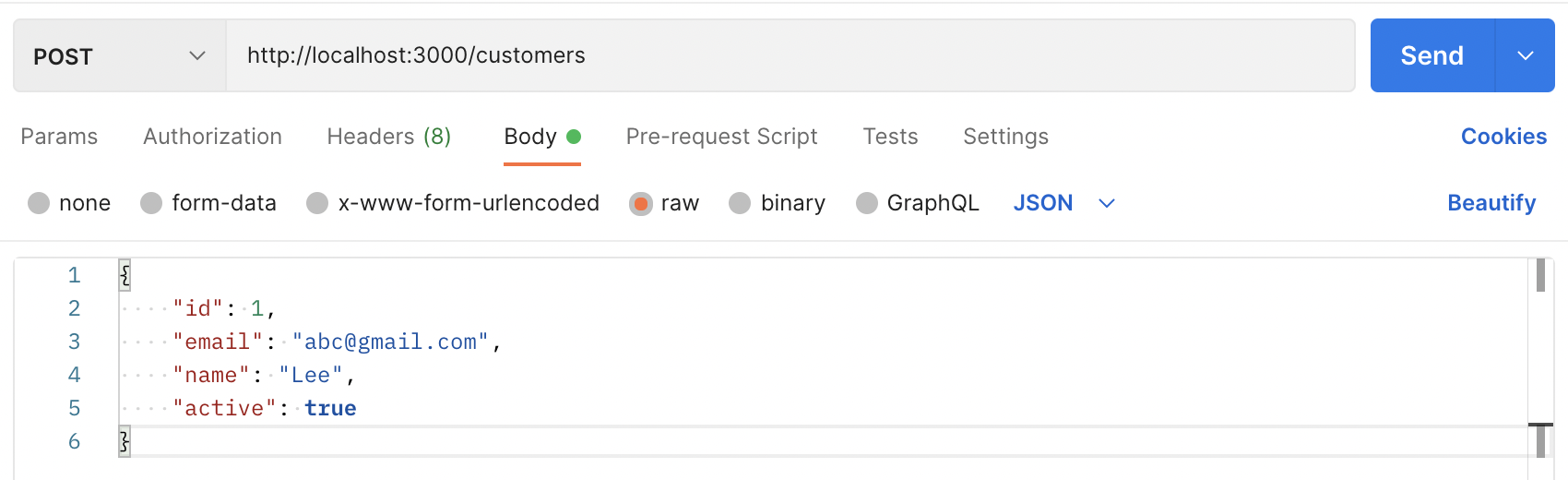 Body에 추가할 튜플의 정보를 json 타입으로 작성하고 send를 보낸다.
